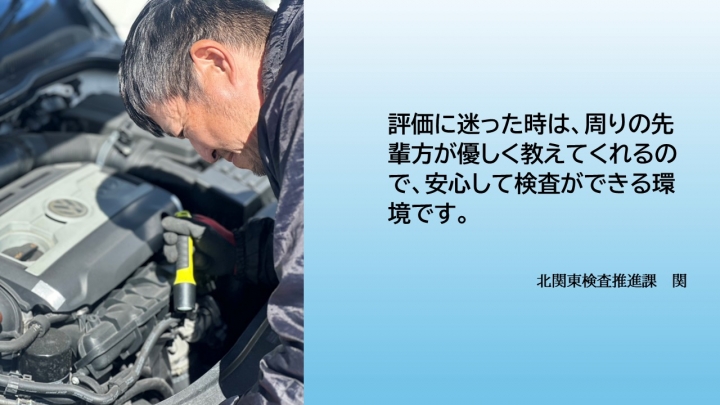 様々な状態の車両を検査し評価を行っています。もし、評価に迷った時は、周りの先輩方が優しく教えてくれるので、安心して検査ができる環境で、毎日業務に励んでいます。